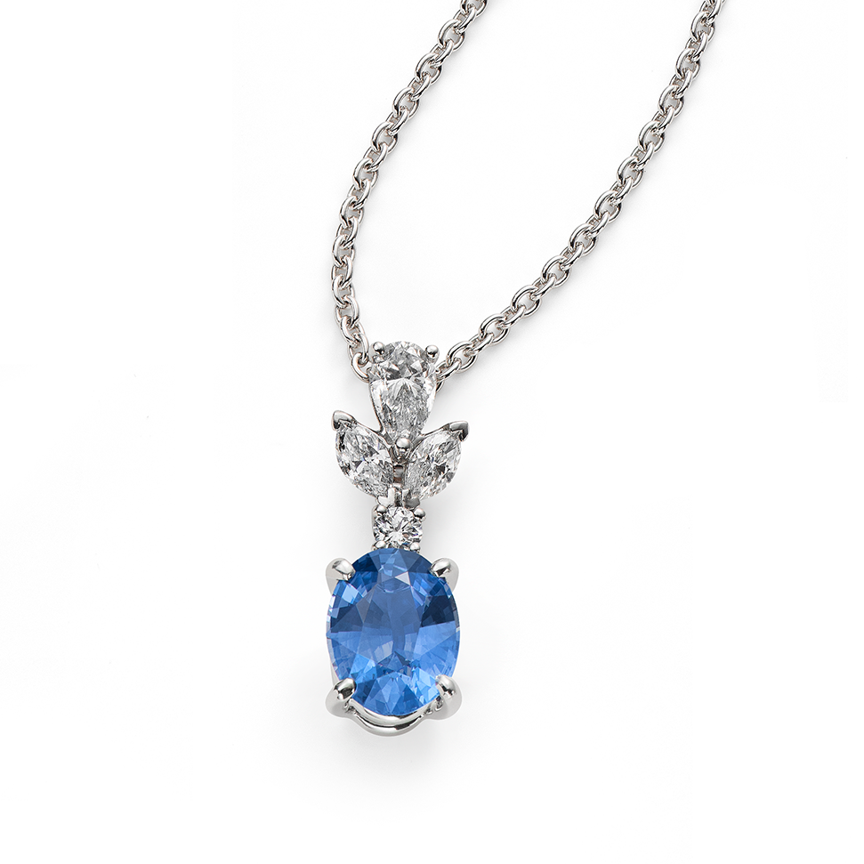 Anhänger in Weissgold 750 mit einem blauen, ovalen Saphir sowie Diamanten im Tropfen- und Navette-Schliff und einem Brillant.