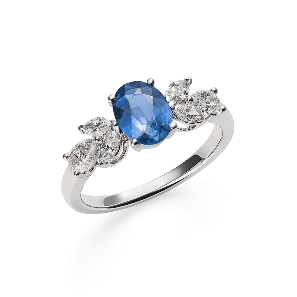 Ring in Weissgold 750 mit einem blauen, ovalen Saphir sowie Diamanten im Tropfen- und Navette-Schliff